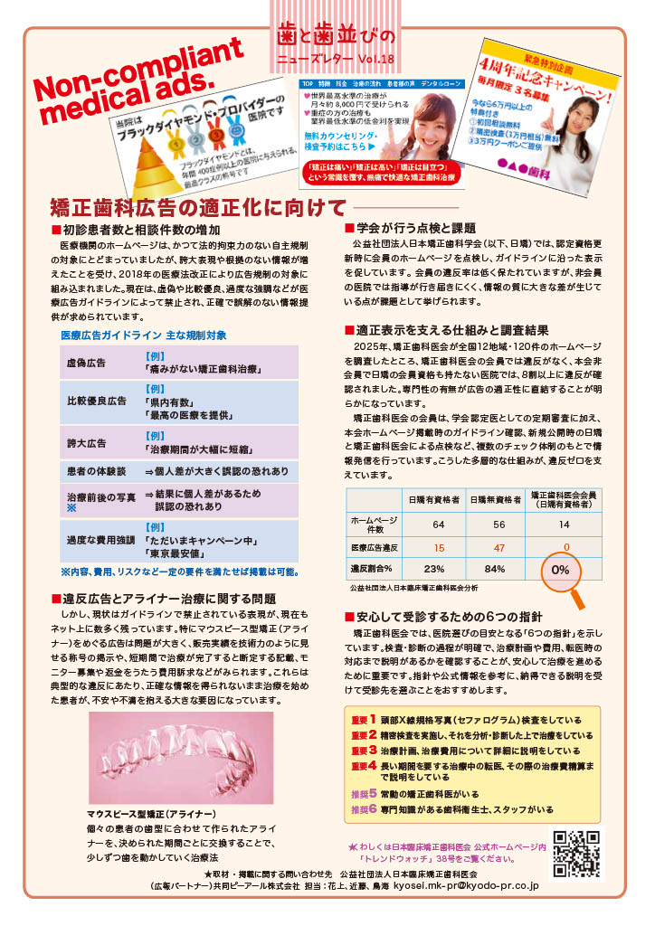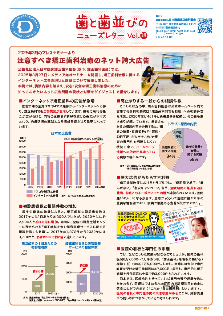 「歯と歯並びのニューズレターVol.18」PDFデータはこちらから取得できます。 院内に掲示したり、患者さんやお知り合いの一般歯科へ配布したりするなどしてご活用下さい。 歯と歯並びのニューズレターVol.18