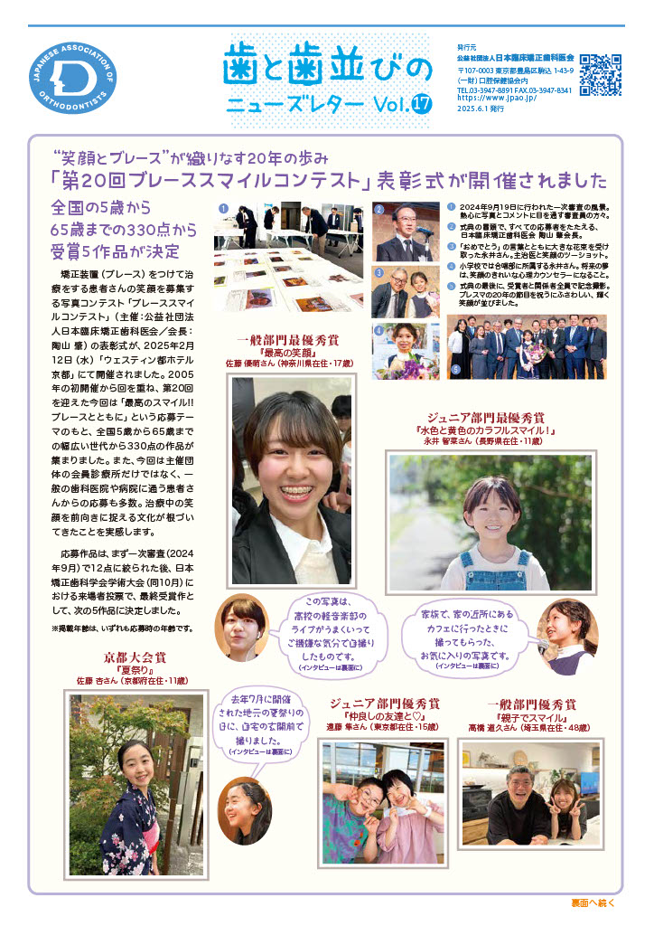 矯正歯科治療中の方を対象とした笑顔のフォトコンテスト「第 17回ブレース スマイル コンテスト」の受賞作品を決定しました。